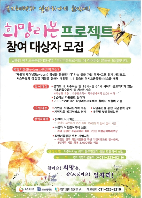 【경기인뉴스】박진영 기자 = 수원시(시장 염태영)가 저소득층의 취․창업 지원을 위한 희망리본 프로젝트를 진행하기로 하고 대상자를 모집한다. 희망리본(Re-Born) 프로젝트는 ‘새롭게 태어날(Re-Born) 당신을 응원합니다’라는 뜻을 가진 복지-고용 연계 사업으로 저소득층의 취․창업을 지원하기 위한 개인별 1:1 맞춤형 복지고용통합서비스이다. 근로능력이 있는 저소득층이 스스로 자립할 수 있도록 복지와 일자리를 one-stop으로 지원한다는 방침이다. 프로젝트를 통해 개인별 자활지원계획 수립, 직업교육 등 취업준비교육과 함께, 일할 수 있는 여건의 마련을 위해 보육․돌봄․가사 등 사회복지서비스 등을 지원한다. 또한 구인처 발굴, 면접교육 등 취업지원서비스를 통한 맞춤형 취업알선 등의 서비스를 제공하며 사후서비스를 통해 직업적응 상담, 경제자립 모니터링 등도 제공한다. 참여 대상자는 경기도 내 거주하는 ▲만18세에서 64세 사이의 근로의지가 있는 기초생활수급자 및 차상위계층(가구총소득이 최저생계비의 120% 이하), ▲3년 이상 자활근로 참여자이며, ▲2009~2010년 희망리본 프로젝트 참여자도 재참여가 가능하다. 시는 프로젝트 참여자 230명을 모집할 예정이며, 참여 희망자는 거주지 동 주민센터 등을 방문해 신청하면 된다. 참여자에게는 혜택도 있다. 참여자에게 연간 최대 100만원의 참여 실비를지급하며 취업에 성공한 수급자에게 최대 2년간 이해급여특례를 보장돼 의료급여와 저녀교육급여 등이 지원된다. 또한 취업할 경우 자산형성을 위한 희망키움통장 우선가입을 지원해 탈수급시, 3인가족 기준으로 최대 3천만원을 적립할 수 있는 기회도 주어진다. 프로젝트에 대한 보다 자세한 사항은 경기희망리본본부(031-223-8219)로 문의하면 된다.