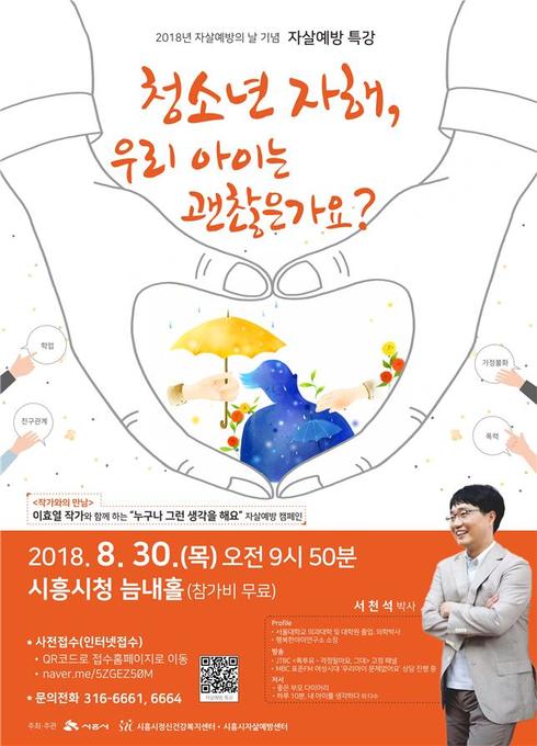 시흥시자살예방센터 주관으로 개최하는 이번 특강은 행복한 아이연구소장 서천석 소아청소년정신건강의학과 전문의의 초청강연으로 진행된다.