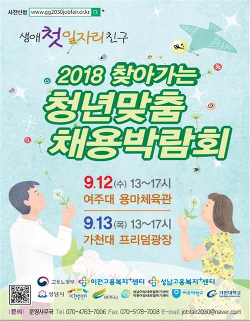 [시사인경제] 성남고용노동지청은 경기 동남부권 7개 대학 및 중부권 4개 대학, 관내 특성화고 및 일반고 전문계과 청년구직자를 대상으로 청년 취업의 어려움을 극복하기 위해 오는 9월12일과 13일 양일간 서울 및 수도권 소재 우수·강소기업 80개소가 참여하는 ' 생애 첫 일자리 친구! , 2018 찾아가는 청년 맞춤 채용박람회'를 개최한다고 밝혔다.