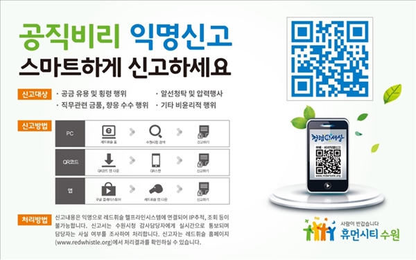 신고는 수원시 홈페이지(www.suwon.go.kr)에 설치된 ‘공직비리 익명신고’ 배너를 클릭하거나, 시스템 위탁 운영사인 레드휘슬 웹사이트(www.redwhistle.org)에 접속해 할 수 있다. 스마트폰의 경우 익명신고 QR코드가 인쇄돼 있는‘클린명함’혹은‘클린스티커’를 스캔해 이용할 수 있다.