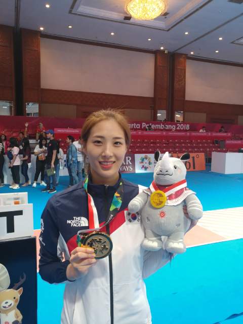 [시사인경제] 안산시 직장운동경기부 소속 최수연 선수가 지난 22일 2018 자카르타 팔렘방 아시안 게임 여자 펜싱 사브르 단체전에서 중국과 접전 끝에 45-36의 승리를 따내고 금메달을 목에 걸었다.