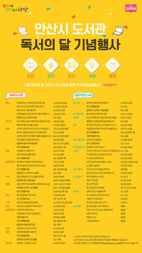 [시사인경제] 안산시 공공 및 공립작은도서관 29개소에서는 9월 독서의 달을 맞아 작가와의 만남, 인문학 강연, 문화공연, 체험프로그램, 전시 등 다양한 독서문화행사를 진행한다.