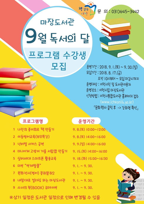 [시사인경제] 이천시 마장도서관은 9월 독서의 달을 맞이해 아동영어교육, 실버세대 스마트폰 활용교육, 넌버벌 서커스 공연 등 다채로운 독서문화 행사를 운영한다.