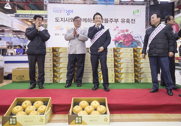 남경필 지사는 16일 오후 2시 수원 권선구 소재 수원농수산물유통센터에서 진행되는 ‘경기농특산물 특판전’에 참여해 1일 세일즈에 나섰다.