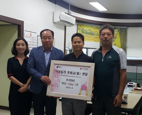 | 우리S&E가 유림동에 이웃돕기용 쌀을 기탁하는 모습 |