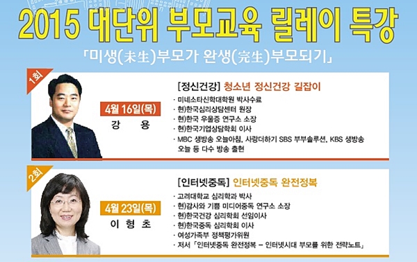 특강은 4월 16일, 23일, 30일(매주 목) 오전 10시부터 12시까지 수원청소년문화센터 온누리아트홀에서 총 3회에 걸쳐 진행되며, 대상자는 학부모 및 청소년 상담·교육관계자이다. 신청은 4월 10일(화)까지 선착순 마감이며 전화(031-215-1318) 또는 홈페이지(www.suwon1318.or.kr)에서 신청가능하다. (참가지 무료)