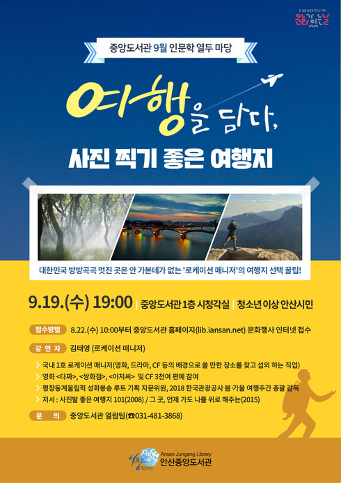 | 중앙도서관 9월 인문학 열두 마당 ‘여행을 담다, 사진 찍기 좋은 여행지’ 강연 포스터 |