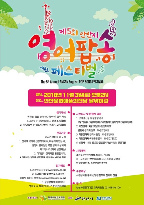 [시사인경제] 안산화정영어마을은 안산시 영어팝송페스티벌을 오는 11월 3일 안산문화예술의 전당 달맞이관에서 개최한다고 밝혔다.