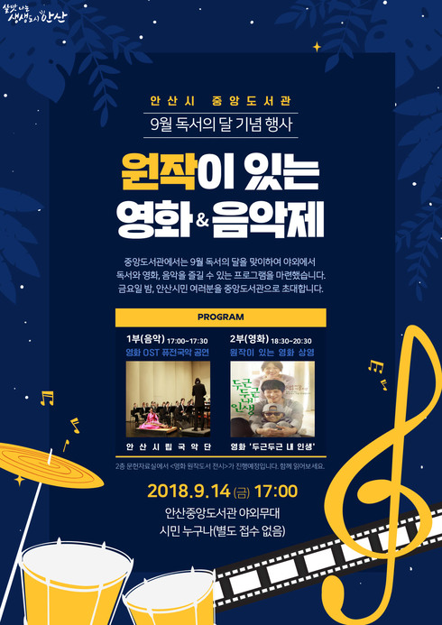 이번 행사는 가을밤에 야외에서 영화와 국악 공연을 즐길 수 있는 프로그램으로, 오후 5시부터 안산시립국악단의 ‘영화 ost’ 퓨전 국악 공연이 진행되고, 저녁 6시 30분부터는 원작이 있는 영화 ‘두근두근 내 인생’이 상영된다. 또한, 문헌자료실에서는 영화 원작도서가 전시된다.