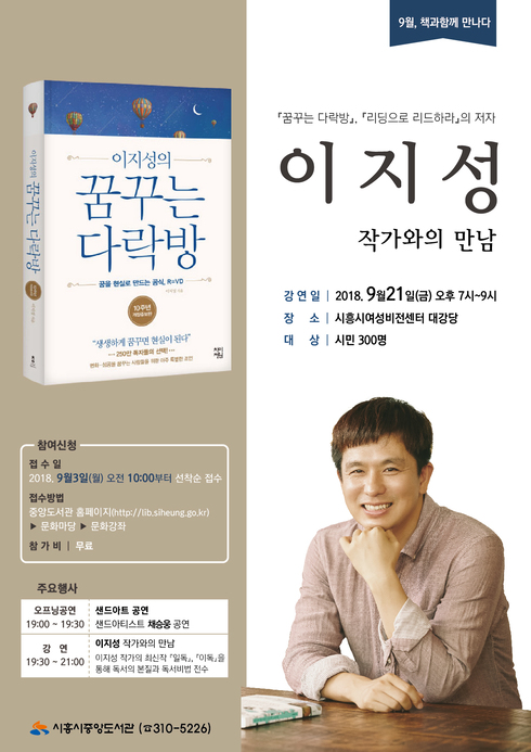 [시사인경제] 시흥시중앙도서관은 오는 21일 저녁 7시, 여성비전센터 대강당에서 '꿈꾸는 다락방', '리딩으로 리드하라' 등으로 큰 사랑을 받은 이지성 작가와의 만남을 개최한다.