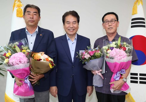 | 백군기 용인시장이 전‧현 용인시 자율방재단장과 기념사진을 찍고 있다. |