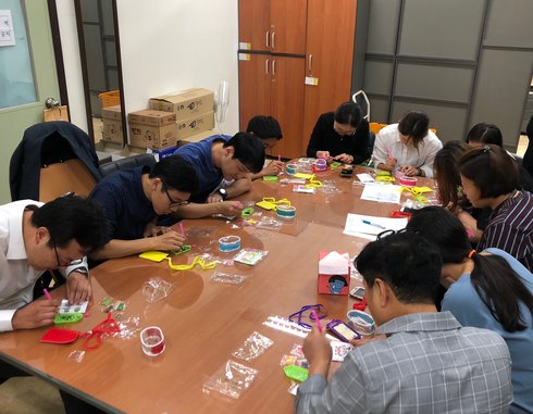 | 하수재생과와 하수시설과 직원 30여명이 지난 17일 업무를 마무리한 후 사무실에서 구슬로 동물캐릭터, 선인장, 아이스크림 등 예쁜 무늬 장식을 하며 카드지갑과 파우치를 만들고 있다. |