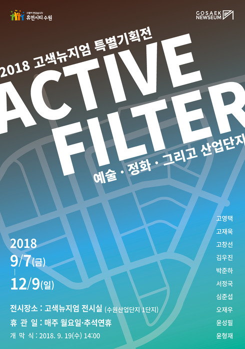 전시 주제인 ‘액티브 필터’는 예술을 통해 현대인들의 지친 마음을 정화한다는 뜻으로 과거 수원 산업단지의 폐수를 정화하던 고색뉴지엄이 사람의 마음을 정화하는 장소로 변화했다는 의미도 함께 담고 있다.