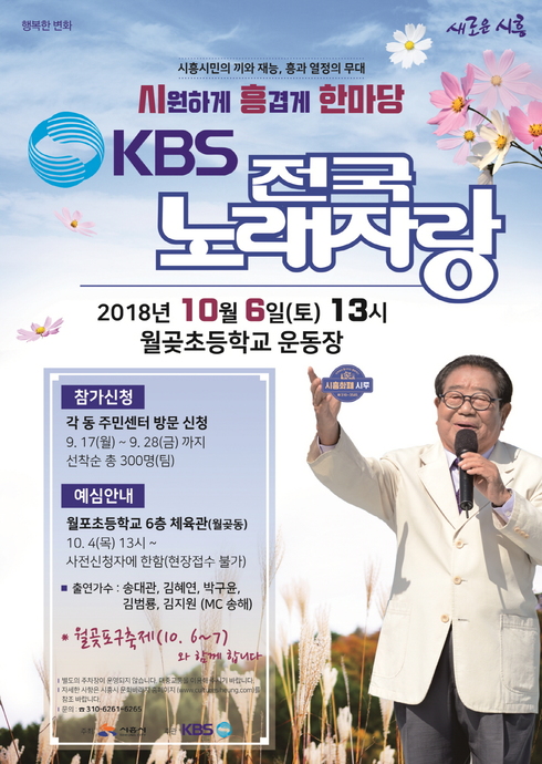 세대를 불문하고 꾸준한 인기를 끌고 있는 국내 최장수 TV 방송프로그램인 KBS 전국노래자랑이 오는 10월 6일 토요일 시흥시 월곶동 월곶초등학교 운동장에서 오후 1시부터 개최된다.