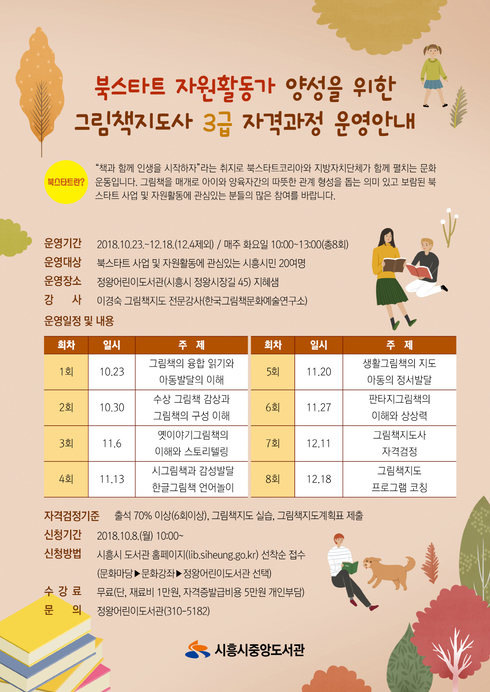 [시사인경제] 시흥시 정왕어린이도서관에서는 북스타트 자원활동가 양성을 위한 〈그림책지도사 3급 자격과정〉을 이번 달 23일부터 운영한다.