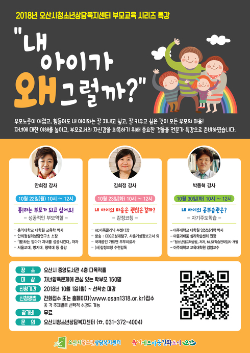 [시사인경제] 오산시청소년상담복지센터는 2018년 부모교육 시리즈특강, ‘내 아이가 왜 그럴까?’라는 주제로 오는 22일, 23일, 30일에 총 3회 일정으로 오산시 중앙도서관 4층 다목적홀에서 부모들을 위한 강의를 개설한다.