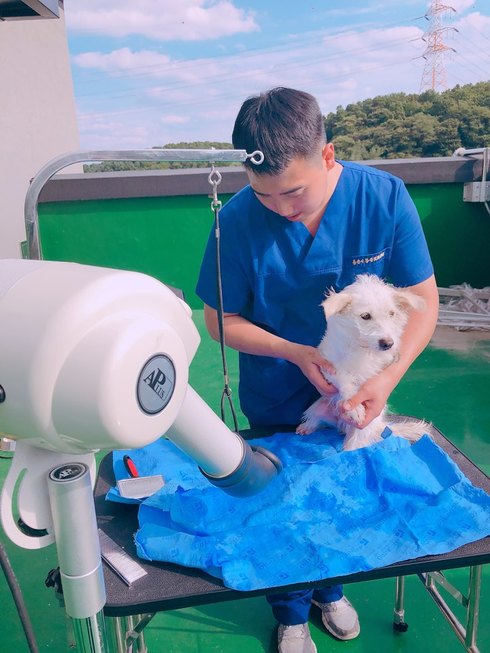 | 용인시 동물보호센터에서 보호중인 유기견이 훈련사와 목욕훈련을 하고 있다. |