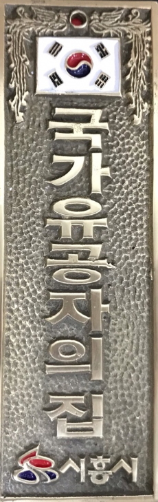 ‘국가유공자의 집’ 문패는 가로6cm x 세로18cm x 두께0.5cm의 신주 금장 재질이다. 상단 중앙의 태극기 좌우에 양각으로 봉황무늬가 그려져 있으며 세로로 ‘국가유공자의 집’이라는 글씨와 하단에는 시흥시 로고가 함께 양각처리 되어있다.