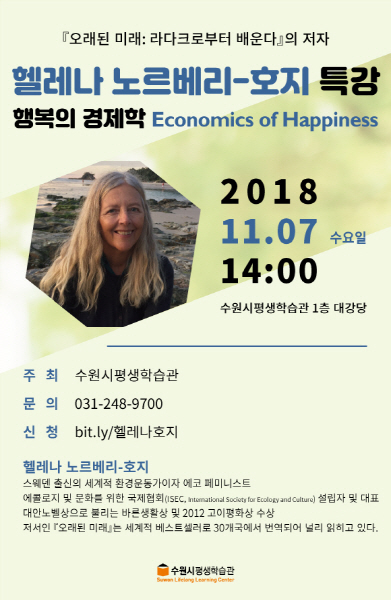세계적인 베스트 셀러 오래된 미래의 저자 헬레나 노르베리 호지 박사가 강연한다.