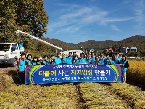 양성면 주민자치위원회는 복지시설 위문 및 봉사활동, 각종 행사에 재능기부 등 지역주민을 위한 다양한 활동을 전개하고 있으며, 이번 농작물 경작으로 얻는 수입은 전액 불우이웃돕기에 사용할 예정이다.