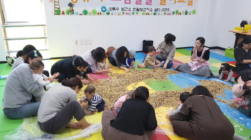 또한 알록달록 색깔놀이, 건강한 곡식놀이, 아기 다람쥐와 도토리 등 계절에 맞는 주제로 엄마와 아기가 함께 참여해 접촉을 통한 정서적 유대감을 향상시켜 신체와 두뇌발달을 돕는 수업이 진행됐다.