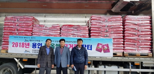 장터에서 용인시농협쌀조합 공동사업법인은 관내 농가서 생산된 백옥쌀 10㎏짜리 400포, 20kg짜리 400포 등 총 800포를 구좌읍 주민들에게 판매했다.