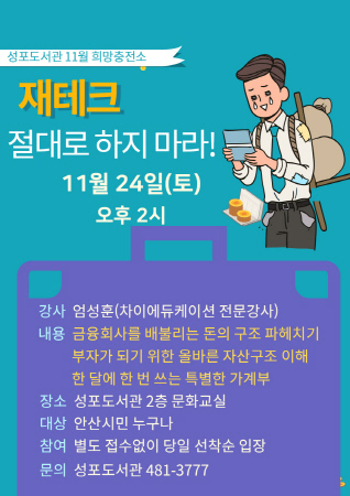 11월 희망충전소는 오는 24일 오후 2시 엄성훈 차이에듀케이션 전문강사를 초청해 ‘재테크 절대로 하지 마라!’라는 주제로 강연을 진행한다.