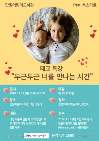 태교에 관심 있는 예비 부모들은 누구나 참여 가능하며, 접수는 단원어린이도서관 홈페이지에서 선착순으로 받고 있다.