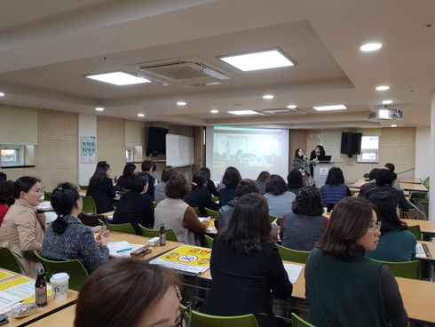 | 수원시 복지허브화추진단 관계자가 16일 시립·직장 어린이집 원장을 대상으로 복지 사각지대 발굴교육을 하고 있다. |