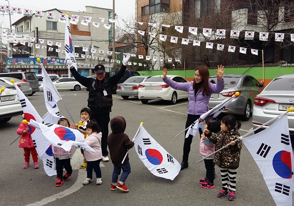 【경기인뉴스】수원시 팔달구 인계동(동장 현영진) 주민센터에 지난 18일 파밀리에 아파트 내 '엄마사랑 어린이집'(원장 김양숙)의 미래 꿈나무들이 찾아와 청사 앞뒤로 게양된 태극기를 견학하며, 나라사랑의 마음을 배우는 시간을 가졌다.