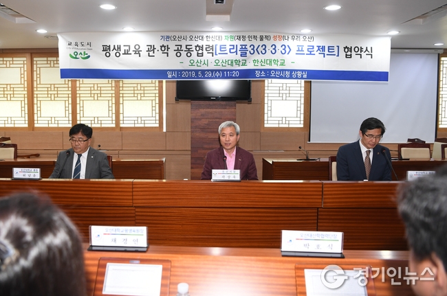 오산시, 오산대학교, 한신대학교 평생교육 협약식오산시는 5월 29일 오산대학교, 한신대학교와 백년학습도시 조성을 위한 평생교육 관·학 협력사업 ‘트리플 3(3