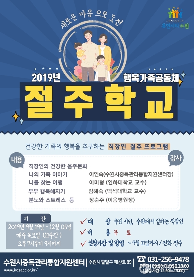 수원시 장안구보건소와 수원시중독관리통합지원센터가 9월 11일까지 ‘2019 절주학교 행복가족공동체 24기’ 참가자를 모집한다.