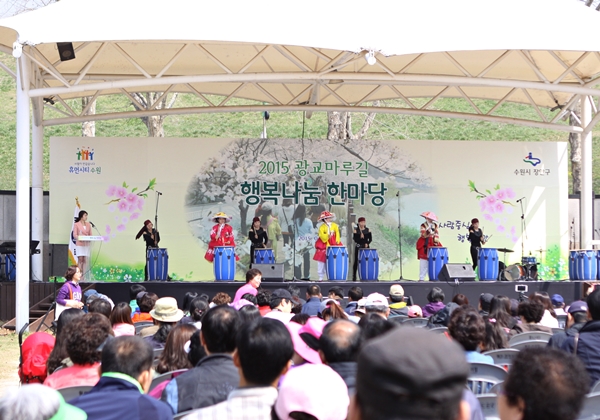 이날 『2015 광교마루길 행복나눔 한마당』에서는 주민자치센터 동아리팀의 식전 공연을 시작으로 수원장안시민오케스트라의 아름다운 선율과 수원시립합창단과 장안구여성합창단의 천상의 하모니를 들어 보며, 초청가수의 공연과 다양한 체험활동과 광교에서 생산한 특산물들을 구입할 수 있었다.