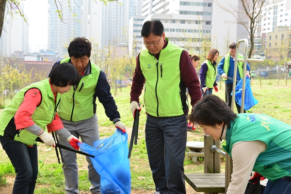 【경기인뉴스】김주호 수원시 영통구청장과 구청 직원들이 지난 15일 지역 단체원 300여명과 함께 인계3호 공원에서 환경정비 활동을 펼쳤다.