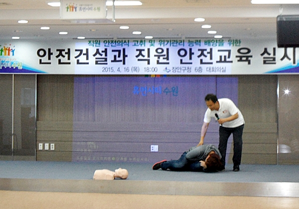 【경기인뉴스】수원시 장안구(구청장 이상윤)에서는 지난 16일 장안구청 대회의실에서 『골든타임 4분의 기적』을 직접 체험하는 심폐소생술(CPR)과 자동제세동기(AED) 전문교육 실시하였다.