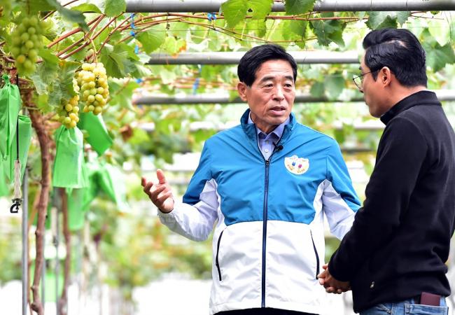 윤화섭 안산시장 “대부도 샤인머스켓 맛보러 오세요” 윤화섭 안산시장이 지난 7일 대부도의 한 포도농가에서 안산시 홍보대사 개그맨 이문재와 배우 이세창 등과 함께 대부도 샤인머스켓을 알리는 유튜브 생방송을 진행했다. 이날 출연자들은 포도 따기 체험과 대부도 포도, 와인, 포도 고추장으로 만든 비빔밥 등을 맛보며 대부도 포도의 우수성을 홍보했다. 윤화섭 시장은 “대부도의 자랑 샤인머스켓을 많은 시민들이 맛보길 바란다”며 “대부도에는 우수한 포도 외에도 다양한 먹거리, 볼거리가 가득하다”고 말했다.
