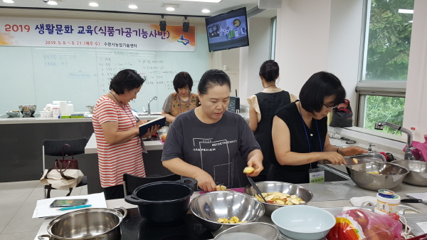 수원시농업기술센터는 관내 농업인의 식품가공 역량을 강화하기 위해 올해 처음으로 식품가공기능사 자격증 취득과정을 운영했다. 교육은 5~8월 매주 수요일 수원시농업기술센터 교육장에서 진행됐다.