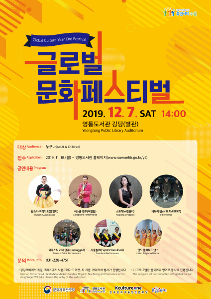 문화체육관광부가 지원하는 이번 축제는 공연과 세계 각국의 문화를 체험할 수 있는 부스 운영으로 이뤄진다. 한국문화예술법인 문화랑과 다문화 커뮤니티 비영리단체 히피코리아가 공동 주최하고 영통도서관이 주관한다.