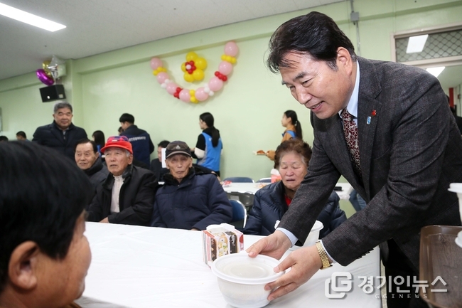 백군기 용인시장이 22일 처인구 이동읍 용인종합사회복지관에서 열린 떡국 나눔 행사에서 참석, 어르신 130명과 떡국을 나눠 먹으며 새해 건강과 희망을 기원했다.