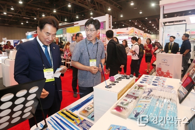 백군기 용인시장이 작년 7월 미국 라스베이거스에서 열린 소비재 ASD 전시회에 참석해 관내 중소기업 부스를 둘러보고 있다. (사진=용인시 제공)