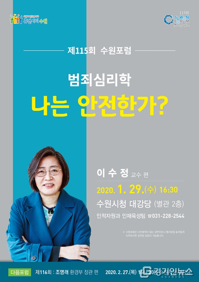수원시가 오는 29일 오후 4시 30분 시청 대강당에서 '범죄심리학-나는 안전한가?'를 주제로 제115회 수원 포럼을 개최한다.