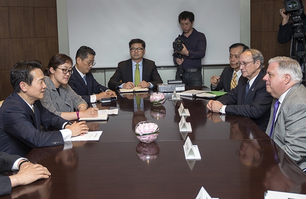 래리 호건 주지사는 “여러 산업이 발달한 한국에 오게 돼 기쁘다.”며 “볼티모어 사태 때 한인 피해가 많았는데 한국인인 내 아내(유미 호건)가 피해 한인들을 일일이 만나며 도움을 주었다. 지난 선거에서도 아내가 당선에 결정적인 역할을 했다.”며 한국에 대한 우호적 태도를 표했다.