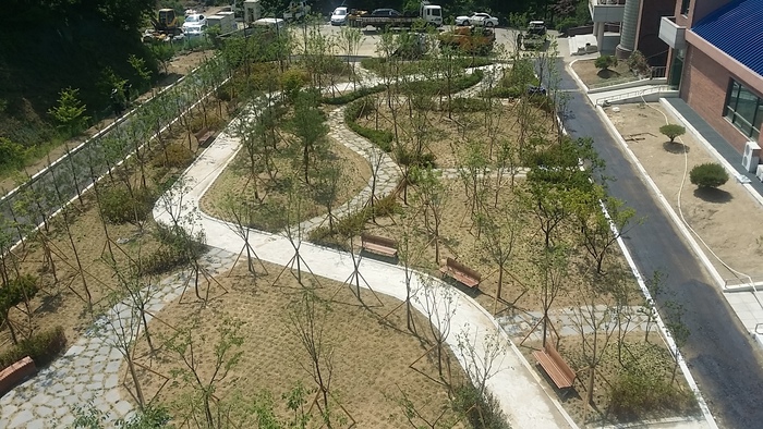 시는 요양원 앞 빈터에 쉼터와 산책로를 만들고 소나무·회양목·구절초 등 등 30여 종의 수목과 화초를 식재해 녹색공간을 완성했다.