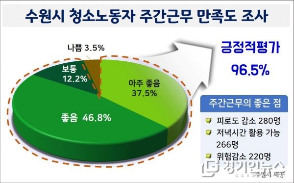 수원시가 지난 4월 1~3일 13개 청소대행업체 근로자 515명을 대상으로 만족도 조사를 진행한 결과, ‘아주 좋음’ 193명, ‘좋음’ 241명, ‘보통’ 63명 등 96.5%가 긍정적인 평가를 했다.