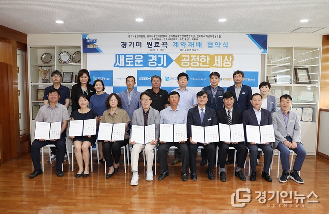 경기도농업기술원과 경기쌀융복합산학연협력단이 도내 4개 쌀 가공업체와 경기미 안정적 수급, 소비 확대를 유도하기 위 '경기미 원료곡 계약재배 협약'을 체결했다. (사진=경기도 제공)