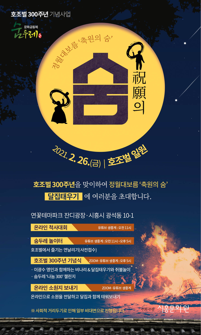 시흥문화원은 2021년 300주년을 맞는 호조벌을 기념하기 위한 ‘호조벌 300주년 기념사업, 문화공동체 숨두레’를 추진한다. 오늘 2월 26일 정월대보름 행사인 ‘축원의 숨’을 시작으로 오는 10월까지 연중 사업으로 진행할 예정이다.