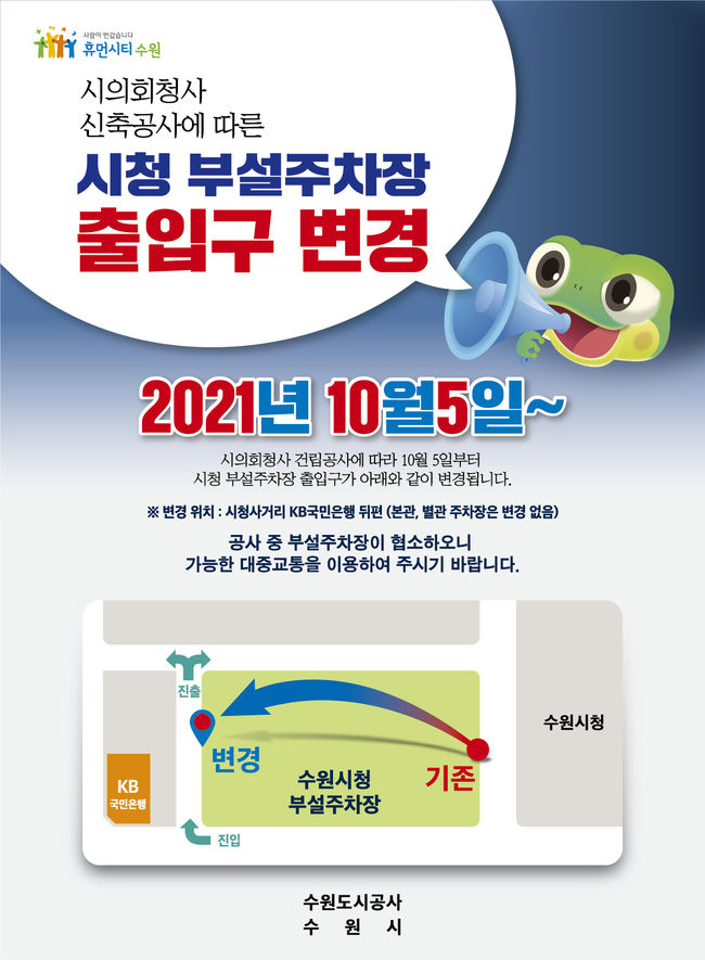 수원시는 시청 본관 오른쪽에 있던 기존 출입구를 폐쇄하고, 시청사거리 KB국민은행 뒤편으로 출입구를 변경한다. 본관·별관주차장 진출입구는 변동 없다.