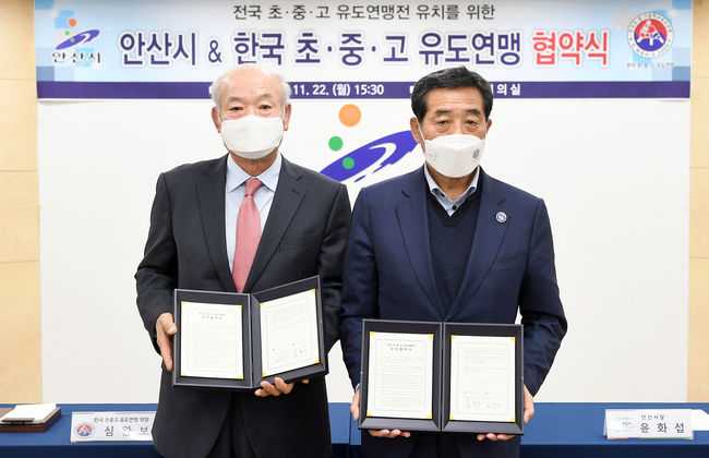안산시-비비큐와 함께 이루는 청년창업...청년상인 공개모집(윤화섭 시장과 윤홍근 제너시스 비비큐 회장이 지난해 11월16일 업무협약을 맺고 있다.)