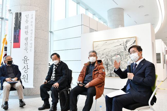 지난 1일 수원컨벤션센터 2층에서 윤상원 열사 수원전시회 개막을 기념해 열린 토크콘서트에서 염태영 수원시장(왼쪽)이 발언하고 있다.