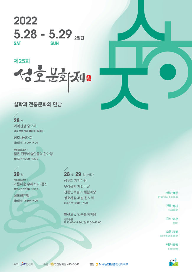안산시는 안산이 낳은 조선 후기의 대학자이자, 실학사상을 꽃피운 성호 이익 선생의 업적을 기리고 정신을 계승하기 위해 이달 28~29일 성호공원 일대에서 ‘제25회 성호문화제’를 개최한다고 26일 밝혔다.